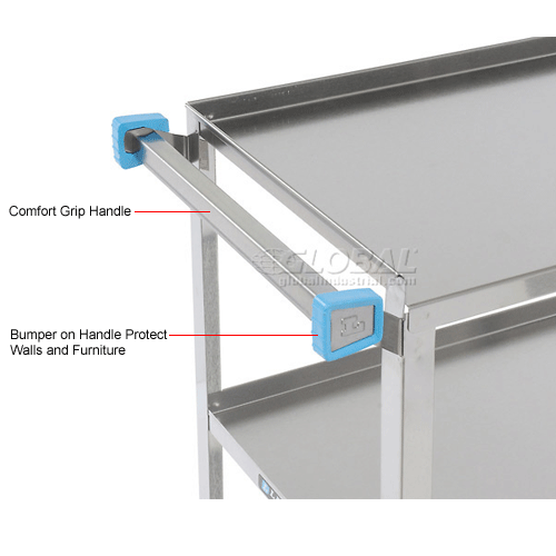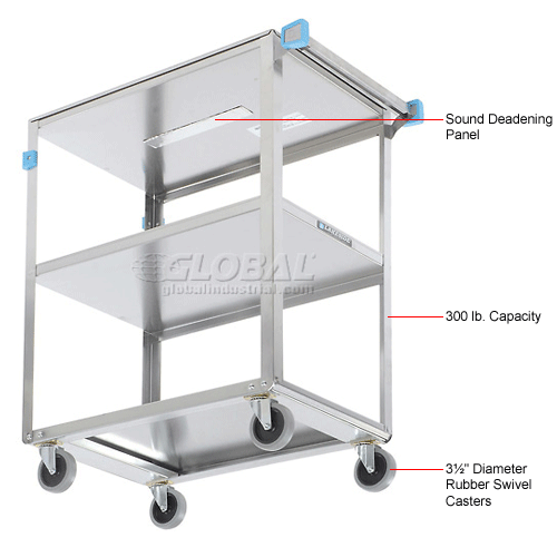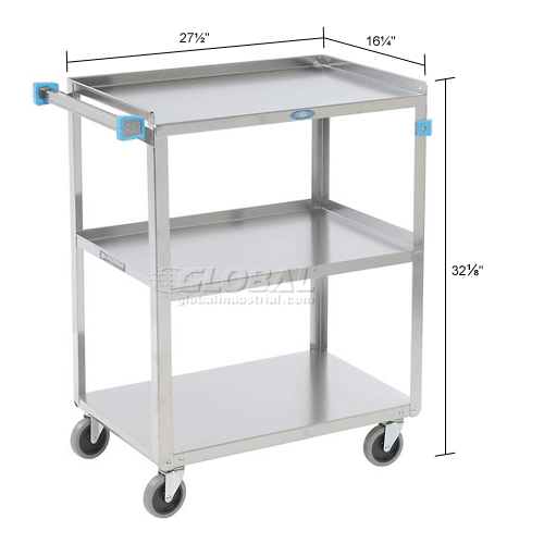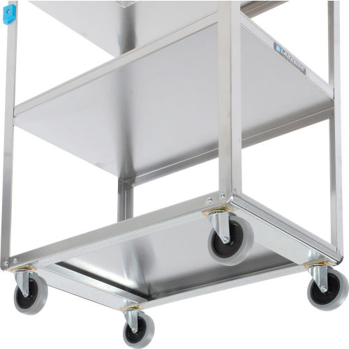 This Lakeside Stainless Steel Utility Cart is ideal for dining area bussing, set-up tray stations, soiled dish stations and transporting light loads. This stainless steel cart features a durable, unitized electronically welded angle leg design for added strength. Shelves are reinforced with a hemmed front. Sound deadening panels under shelves restrict vibration and noise. Bumpers on legs and handles protect walls and furniture. Top and middle shelf feature raised retaining lips on 3 sides. Easy-to-clean. Moves easily on swivel casters. 3 shelf quantity. 300 lb. capacity. 27-1/2"L x 16-1/4"W x 32-1/8"H overall