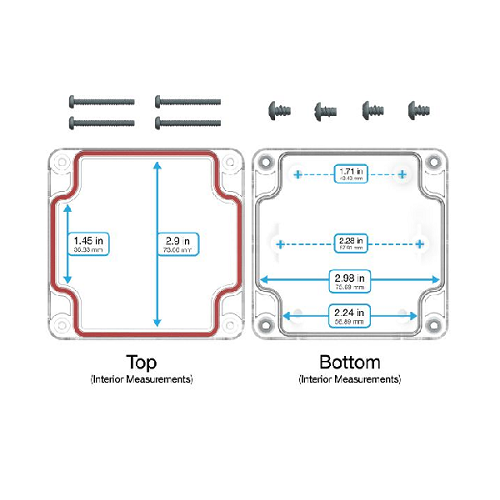 The RB series is a plastic electronic enclosure box made from lightweight, UV-stable, and impact-resistant polycarbonate. The enclosure colors are gray, clear, and black. The fixed circuit location height and with are given as 3.22 x 3.15 x (0.80 / 1.60 / 2.80) in.   Stainless steel screws and threaded metal inserts ensure this enclosure will last in industrial and outdoor environments. All RBs are equipped with a dust and waterproof (IP67) perimeter seal. As with all of our electronic enclosures, it has built-in PCB mounting options, comes in a range of colors and sizes, and is ready for your DIY and OEM electrical project. The top cap clear bottom clear electronic enclosures are to be tight with screws.
