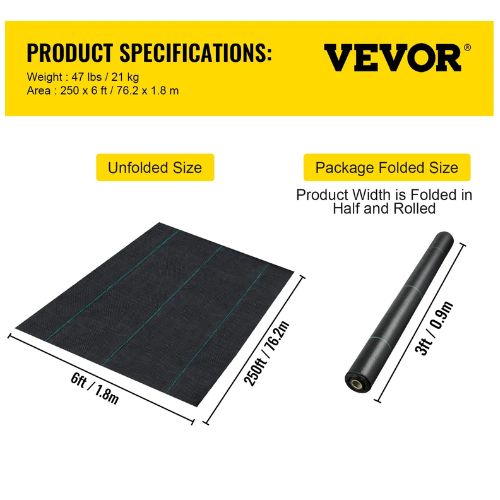 Pro-environment & Durable Fabric: The landscape weed barrier fabric adopts professional-grade polypropylene material, which is durable and high-strength. The landscape fabric can prevent the weed from growing and make your daily gardening effortless. Its size: 6 x 250 ft.