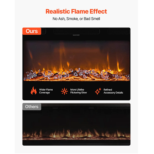 This fireplace supports both mechanical button control and remote control to adjust flame color, brightness, and heat. The 1–8 hour timer allows you to set an automatic shutoff in 1-hour increments, saving energy securely and easily.