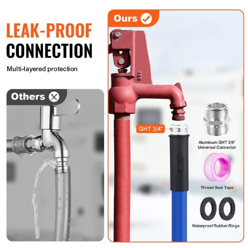 Equipped with a 3/4" (1.9 cm) GHT aluminum connector, the hose is compatible with most U.S. water sources and fits garden and outdoor hoses. It also includes waterproof rubber rings and thread seal tape to ensure enhanced sealing and prevent leaks.