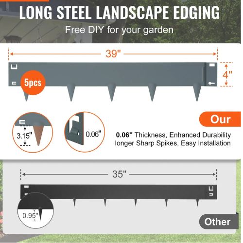 Various Sizes: VEVOR steel landscape edging is available in a set of 5 pieces, each measuring 39x3 inches. The extended spikes make secure ground anchoring, allowing you to create clean lines and spaces in your lawn. Loved by gardening enthusiasts.