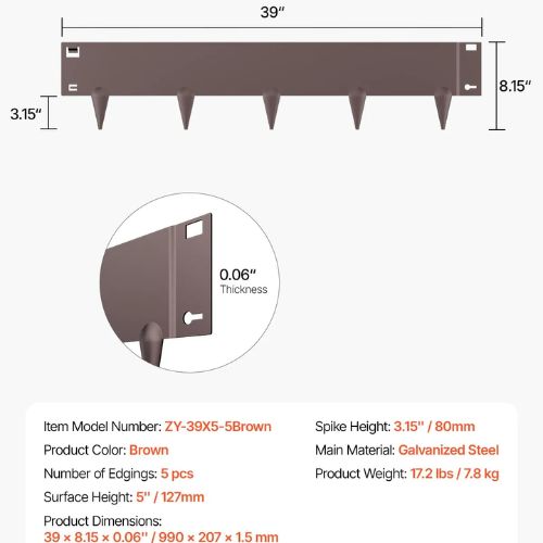 39 x 5 Inch Rust-Resistant Garden Edging Border Steel Landscape Edging ZY-39X5-5Brown (Pack of 5)