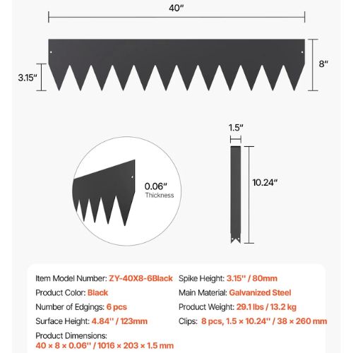 What You’ll Receive: The set includes 6 metal yard edgings, 1 pair of installation gloves, 8 clips, and 1 instruction manual. The extended spike design makes it easier to drive the pieces into the ground, reducing installation effort. Spend more time enjoying your outdoor space and less time on maintenance!