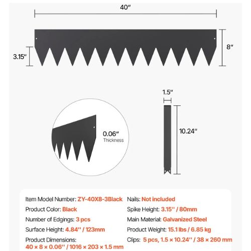 What You’ll Receive: The set includes 3 metal yard edgings, 1 pair of installation gloves, 5 clips, and 1 instruction manual. The extended spike design makes it easier to drive the pieces into the ground, reducing installation effort. Spend more time enjoying your outdoor space and less time on maintenance!