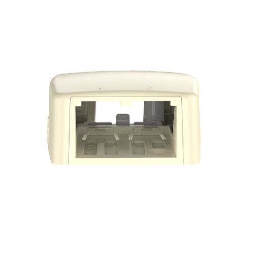 Surface Mount Boxes shall have a low profile design and be available in a variety of port densities. Boxes shall accept most Mini-Com® Modules for fiber, copper, and audio/video applications. The boxes shall mount with screws, adhesive, or optional magnets. The box covers include breakouts for use with surface raceway. Cable tie slots shall be included to provide strain relief on incoming cables. Select boxes shall include a cover with a quick release feature.