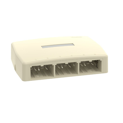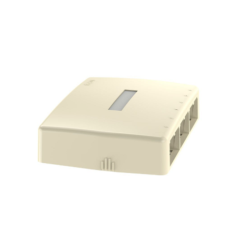 Surface Mount Boxes shall have a low profile design and be available in a variety of port densities. Boxes shall accept most Mini-Com® Modules for fiber, copper, and audio/video applications. The boxes shall mount with screws, adhesive, or optional magnets. The box covers include breakouts for use with surface raceway. Cable tie slots shall be included to provide strain relief on incoming cables. Select boxes shall include a cover with a quick release feature.