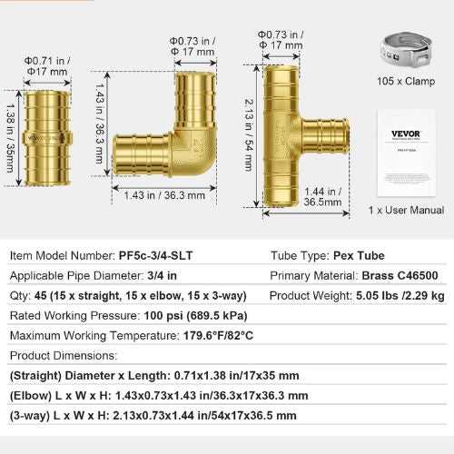 This set of pipe fittings includes 15x Clamp Straights, 15x Clamp Elbows, 15x Clamp Tees, and 105x Clamps, all meeting the same standards for commercial and residential plumbing applications. Each fitting can withstand pressures of up to 100 PSI and temperatures of 82°C/179.6°F.