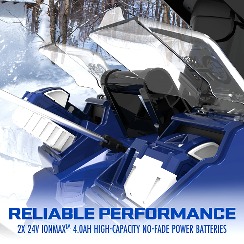 The 48V blower clears an 18" wide x 10" deep path and throws snow up to 20 feet with an adjustable 180º chute.