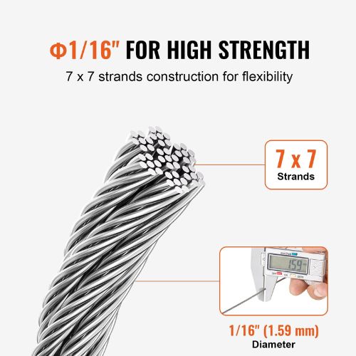 1/16 Inch 7x7 Strand T304 Stainless Steel Braided Aircraft Cable 330FT With Accessories