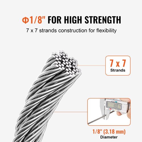 This 1/8" (3.18 mm) stainless steel cable features a 7×7 braided construction, which strikes an ideal balance between flexibility and strength. Unlike other core types, the 7×7 design makes it easy to bend or fold—perfect for projects like garden fencing or decorative railings.