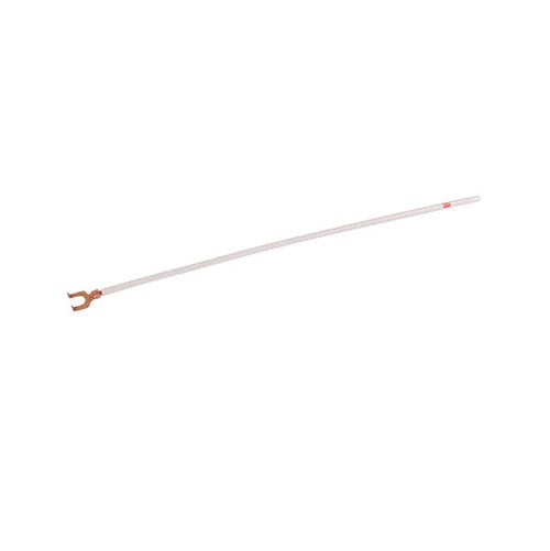 PIGTAIL 14 STRANDED 8IN WHITE. A "Pigtail, Stranded Wire, Spade Terminal/Stripped, White, 14AWG, 8 inches" is a specialized electrical component. This type of pigtail is useful in various electrical installations where a flexible connection is needed, such as in control panels, machinery, and appliances. The spade terminal end allows for quick and secure connections to terminal blocks or equipment, while the stripped end can be used for splicing, connecting to devices, or attaching to other wiring with wire nuts or similar connectors.
