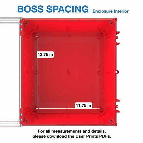 • In the context of an industrial enclosure, boss spacing would refer to the arrangement or distribution of these raised portions to ensure secure and appropriate fastening of the enclosure’s components.