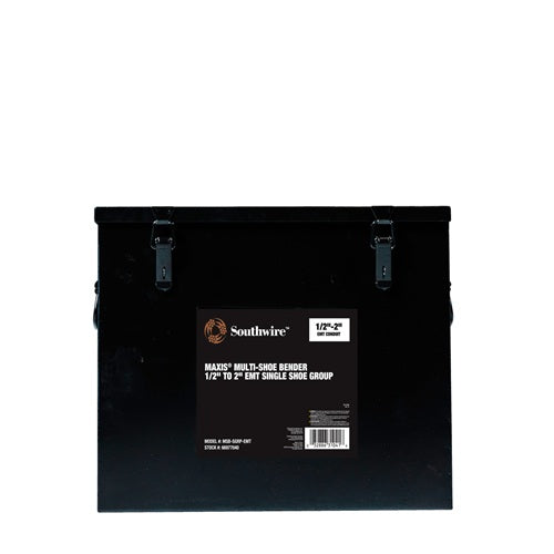 The MSB2000 IMC Shoe Group consists of a Bending Shoe and Roller Assy for IMC conduit. Bender sold separately. Includes metal storage box with hinged top and latch.