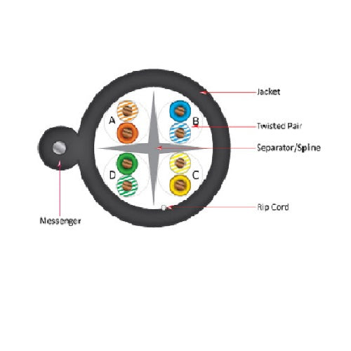 Category 6 UTP Outdoor-Rated Cable with Messenger, 550 MHz, 23 AWG Solid Bare Copper Conductors.