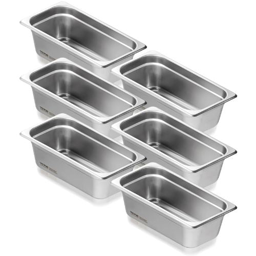 1/3-Size Steam Table Pan: 6-pack of 1/3-size steam table pans, made from food-grade SUS201 stainless steel. You can use these pans to hold various meats, vegetables, fruits, ice cream, and any other foods.