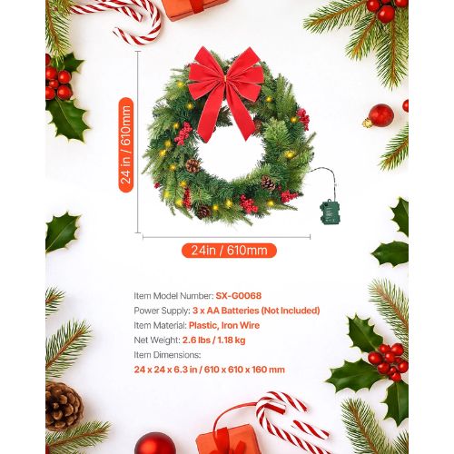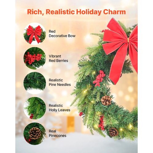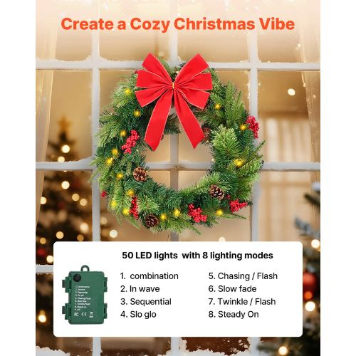 This 24-inch Christmas wreath features lifelike pine needles, holly leaves, pine cones, and red berries. It comes with a decorative bow and 50 LED lights offering 8 lighting modes and a timer. Pre-assembled for effortless hanging, it’s weather-resistant and perfect for adorning front doors, fireplaces, or windows.