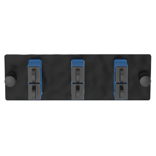 The Opticom SC fiber adapter panel is OS2 and is loaded with 3 SC duplex fiber optic adapters. The fiber optic adapters are blue with zirconia split sleeves.