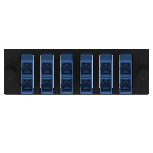 The Opticom SC fiber adapter panel is OS2 and is loaded with 6 SC duplex fiber optic adapters. The fiber optic adapters are blue with zirconia split sleeves.