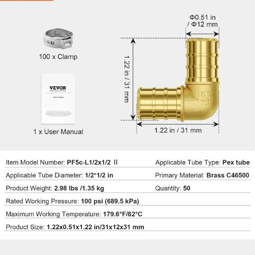 Professional Safety: This set of pipe fittings includes 50 clamp elbows and 100 clamps, all meeting the same standards for commercial and residential plumbing applications. Each fitting can withstand pressures of up to 100 PSI and temperatures of 82°C/179.6°F.