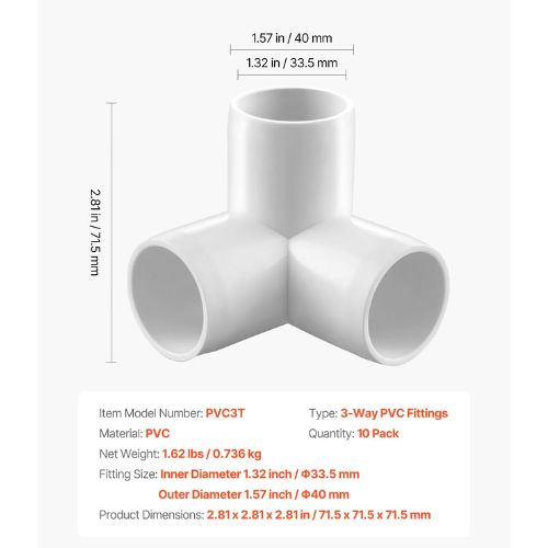 Our 3-way PVC fittings are compatible with 1-inch PVC pipes, delivering a strong, secure connection that resists wear, corrosion, low temperatures, and UV exposure. These fittings are perfect for a variety of DIY projects, including storage frames, shoe racks, and animal enclosures.