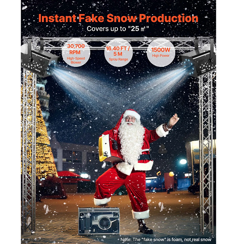 Equipped with a robust 1500W motor operating at 30,700 RPM, this snow machine delivers a spray distance of up to 16.40 ft (5 m) and covers up to 25㎡ with realistic snow-like foam. With its large 5L fluid tank, it quickly produces immersive snowfall effects suitable for long-duration use.