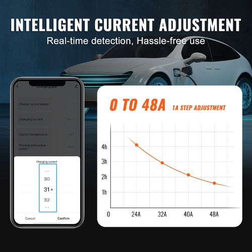 Our Level 2 EV charging station features smart recognition technology that automatically detects your home’s circuit capacity. If the system identifies that your circuit cannot handle full charging power, it automatically adjusts to a safer, suitable charging level—giving you peace of mind. Current is adjustable in 1A increments, with a full range from 0 to 48A.