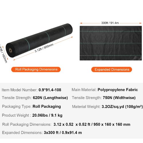 Heavy-Duty Weed Barrier Fabric: Crafted from 3.2 OZ high-density, tear- and corrosion-resistant polypropylene, VEVOR 3 x 300 FT woven weed barrier landscape fabric is the preferred choice for agriculture and industry. It ensures superior weed prevention and promotes soil health, keeping your landscaping weed-free for an extended period.