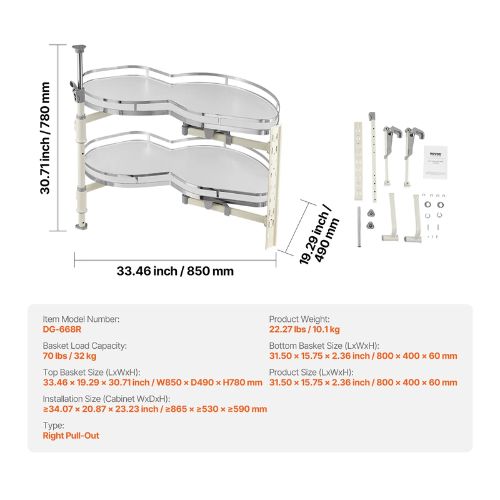 Sturdy Construction: Made with a carbon steel frame and chrome plating, the blind cabinet pullout system exceeds a level 8 rust resistance rating, ensuring high durability and rust prevention. Each layer can support up to 33 lbs/15 kg, with a total weight capacity of 70 lbs/32 kg, making it suitable for heavy items.