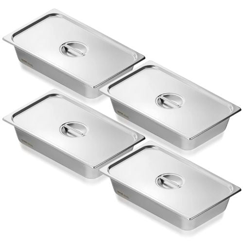 • Full-Size Steam Table Pan with Lids: 4-pack of full-size steam table pans, made from food-grade SUS201 stainless steel. These pans are perfect for holding various foods such as meats, vegetables, fruits, ice cream, and more.