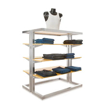 • Bold, 2-sided merchandiser (use shelves, handrails, or both) with a generous top shelf for displays forms or signage. 2" square steel tubing with satin chrome finish. Accepts 48"x12" shelves and 48" long rails. Universal slotting front & back for shelf brackets & handrails. (1/2" slots on 1" centers). Included is one (1)44"x30"x3/4" thick MDF/Melamine top shelf in Hard Rock Maple Finish. Use our TSF481H shelf for a matching look.