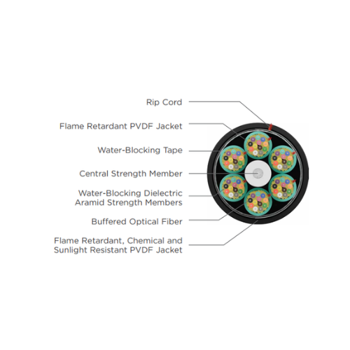 2 – 24 Fiber Single Unit: Flexible tight buffer material extruded over fiber to 900 μm diameter; color coded fibers are combined with dielectric aramid yarns for strength