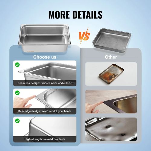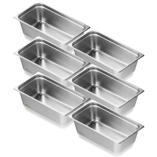 Full-Size Steam Table Pan: 6-pack of full-size steam table pans, made from food-grade SUS201 stainless steel. You can use these pans to hold various meats, vegetables, fruits, ice cream, and any other foods.