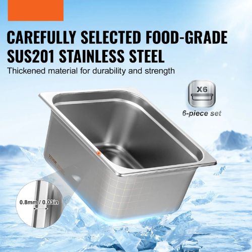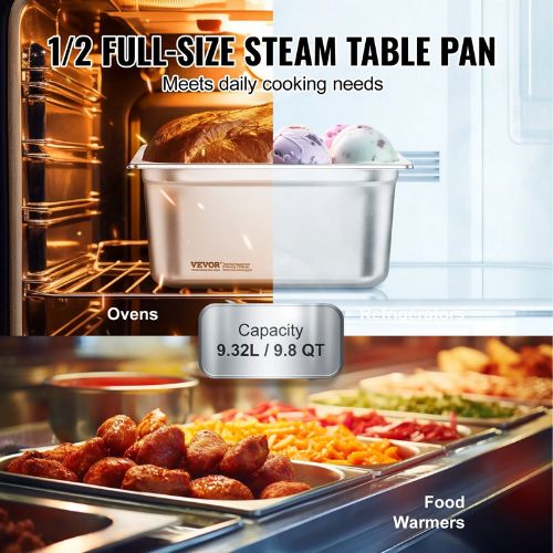 1/2-Size Steam Table Pan: 6-pack of 1/2-size steam table pans, made from food-grade SUS201 stainless steel. You can use these pans to hold various meats, vegetables, fruits, ice cream, and any other foods.
