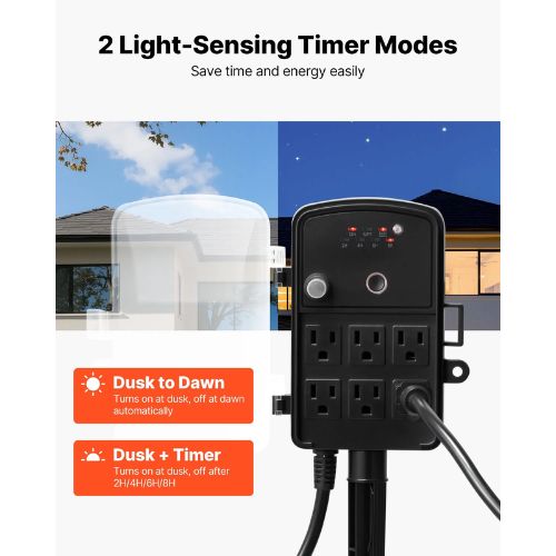 Automatically turns on at dusk and off at dawn, or customize your schedule with 2H, 4H, 6H, or 8H timer settings. Featuring 6 outlets, this outdoor power strip lets you run multiple devices simultaneously with ease. Manage your outdoor power effortlessly with this all-in-one stake solution.