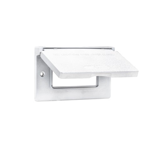 One-gang weatherproof GFCI horizontal cover electrical fittings feature superior commercial-grade die-cast metal construction with a premium powder coat finish for strength and resilience. The durable horizontal GFCI features a weather seal gasket to keep out moisture and other damaging elements. The aluminum cast cover is fabricated with a spring-loaded lid for easy accessibility and secure closure.