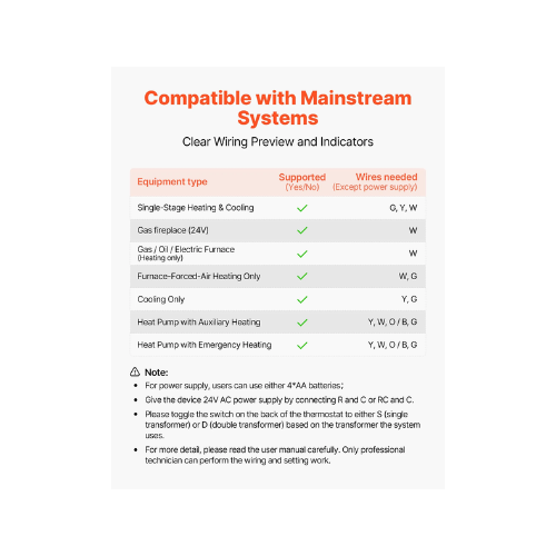 This home thermostat works with underfloor heating, snow melting, AC, heat pumps, gas, and water heating systems, using floor/indoor sensors for temperature control. (Requires dry battery or 24V wiring)