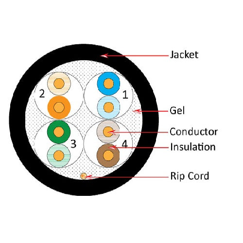 Category-5E CMXF Direct Burial, Flooded Core, 8-Conductor, Outdoor Jacket, AWG24 Solid Bare Copper.