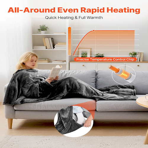 Manta térmica portátil de 127 x 178 cm con mangas y bolsillo para el pie, 10 niveles de calor, apagado automático a las 12 h, lavable a máquina, color gris