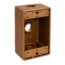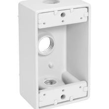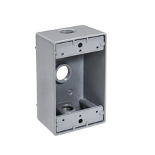 1/2" Threaded Hub Single Gang 3-Hole Weatherproof Box. Superior commercial-grade die-cast metal construction with a premium powder coat finish for strength and resilience. Single, double and triple gang boxes are designed to accommodate multiple applications. The 3-Hole, Double Gang Box features a 31 cubic inch capacity and is complete with closure plugs, mounting lugs and grounding screws for a fast and easy installation.