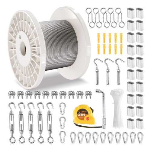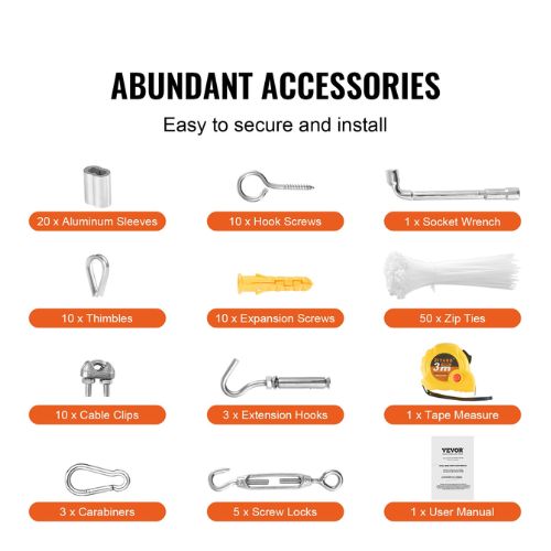 Package Content | 20 × Aluminum Sleeves 10 × Thimbles 10 × Hook Screws 3 × Carabiners 5 × Screw Locks 3 × Extension Hooks 10 × Cable Clips 10 × Expansion Screws 50 × Zip Ties 1 × Socket Wrench 1 × Tape Measure (3 m) 1 × User Manual |