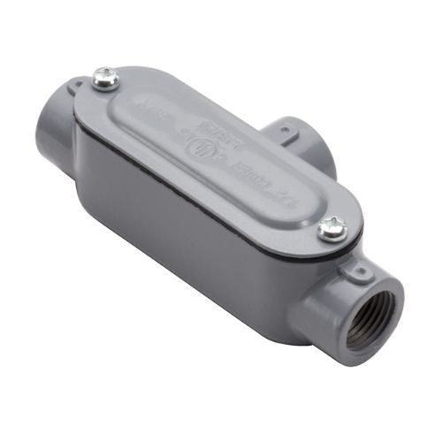 T-type conduit bodies allow 3-way inline access in conduit systems, provide easy access for splicing and pulling, and can correct and change the direction of conduit runs. Smooth, rounded integral bushings in hubs offer protection for conductor insulation. Excellent ground continuity and corrosion resistance; lightweight aluminum construction; cover and watertight gasket ensure weatherproof installations.