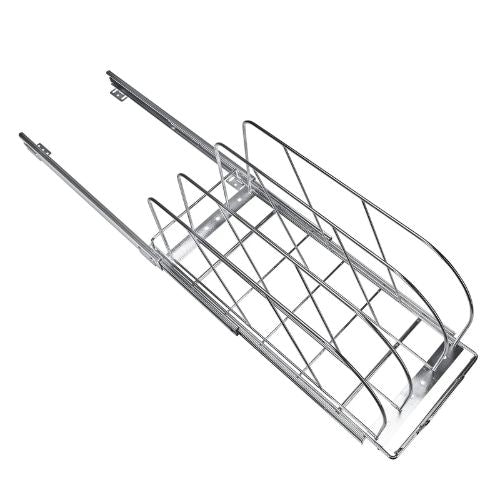 Spacious Storage Space: Ready to say goodbye to your messy kitchen with our pan and pot rack. This sliding kitchen cabinet organizer can hold frying pans, baking pans, serving trays, cutting boards, and lids, making them easily accessible.