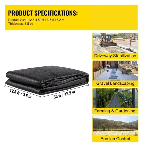 Large Geotextile Fabric: The geotextile driveway fabric has a 625 sq. ft. coverage area, length: 50 ft./15.2 m, width: 12.5 ft./3.8 m. According to your needs, it can be cut to function for driveway stabilization, gardening, agriculture, and drainage.