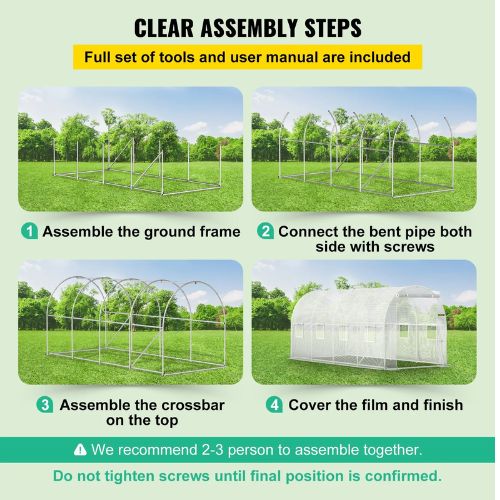 All Tools Included: The hoop house greenhouse is easy to assemble with connectors, and screw covers can prevent scratches and rust. Includes 4 ropes, stakes, and guy ropes for added security, stability, and strength. Note: Do not tighten screws until the final position is confirmed.