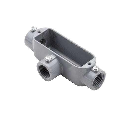 T-type EMT and rigid conduit allow 3-way inline access in conduit systems, provide easy access for splicing and pulling, and can correct and change the direction of conduit runs. Smooth, rounded integral bushings in hubs offer protection for conductor insulation. Excellent ground continuity and corrosion resistance; lightweight aluminum construction; cover and watertight gasket ensure weatherproof installations.
