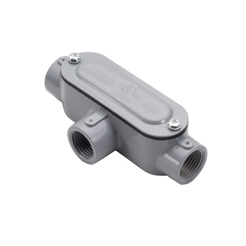 T-type conduit bodies allow 3-way inline access in conduit systems, provide easy access for splicing and pulling, and can correct and change the direction of conduit runs. Smooth, rounded integral bushings in hubs offer protection for conductor insulation. Excellent ground continuity and corrosion resistance; lightweight aluminum construction; cover and watertight gasket ensure weatherproof installations.