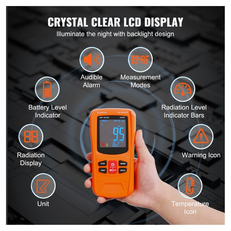 3-in-1 EF, MF & RF Detection: Accurately measures electric fields (EF), magnetic fields (MF), and radio frequency (RF), instantly revealing hidden radiation sources to help you maintain a safer environment.