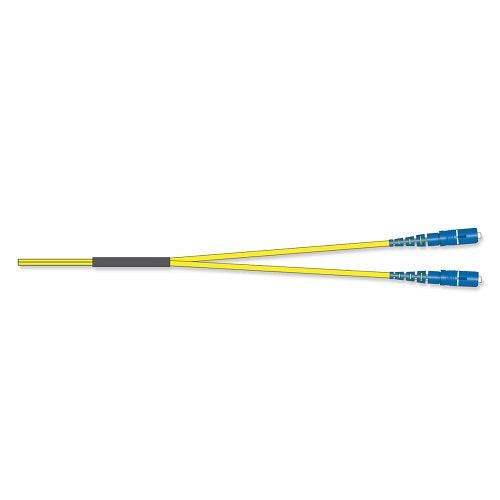 Two-fiber cable assemblies are offered with a variety of connector and cable combinations. Connector options include LC, SC, FC, ST compatible, and MT-RJ. RoHS compliant Zipcord, DFX, MIC, Fan-out, and RIC cables are available. Additional detailed furcation images are available in the Cable Assembly Family Specification Sheet.