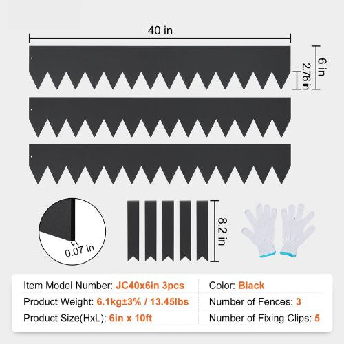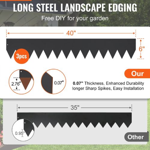 Various Sizes: Steel landscape edging is available in a set of 3 pieces, each measuring 40x6 inches. It comes with 5 clips for effortless installation. The extended spikes make secure ground anchoring, allowing you to create clean lines and spaces in your lawn. Loved by gardening enthusiasts.